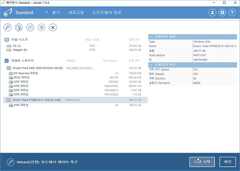 중요한 데이터가 들어있는 파티션을 포맷한 경우, 복구천사 Standard 첫 화면에서 파티션을 선택하지 말고